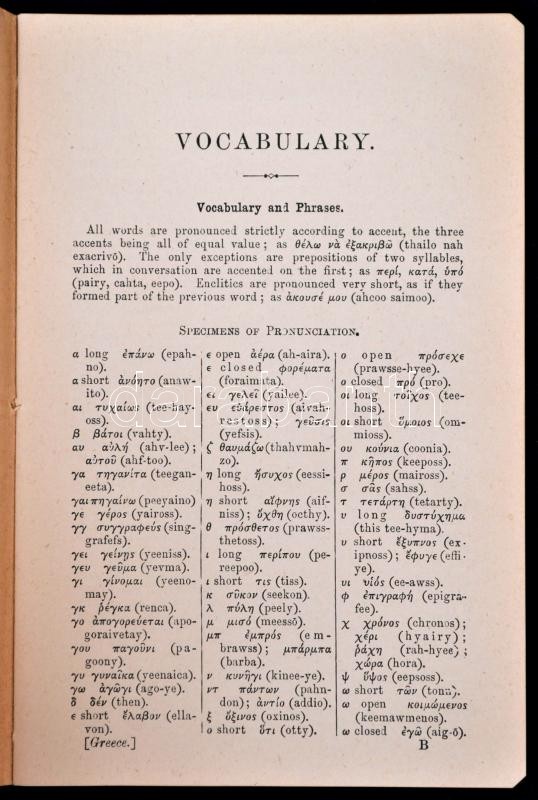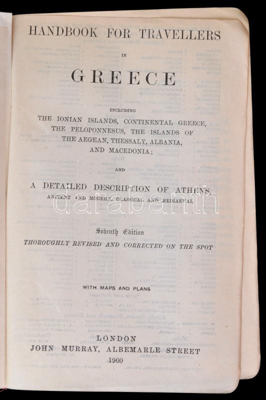 Handbook for travellers in Greece. Murray's Hand-book. London, 1900, John Murray. Szövegközti illusztrációkkal, térképekkel, vázlatokkal illusztrált. Görög-angol szójegyzék melléklettel. Kiadói aranyozott egészvászon-kötés, sérült, kopott gerinccel, a térkép melléklet hiányzik./Handbook for travellers in Greece. Murray's Hand-book. London, 1900, John Murray. Linen-binding, with worn and damaged spine, without map appendix, with greek vocabulary, in English language.