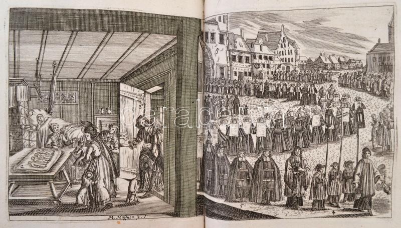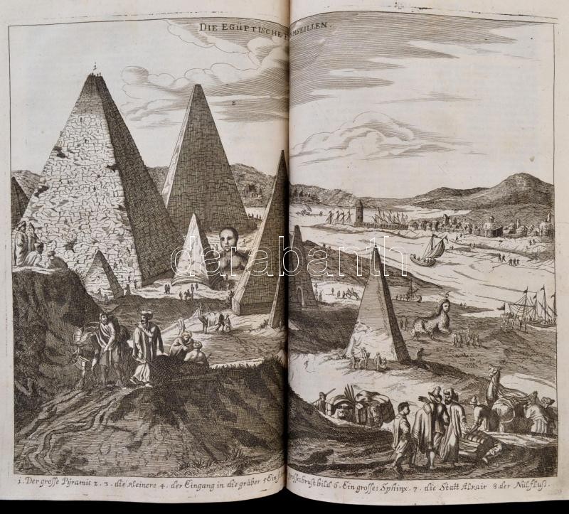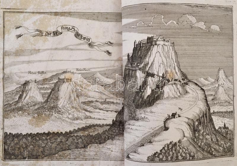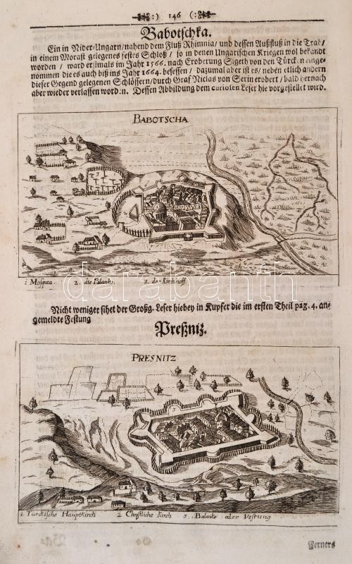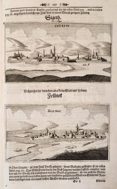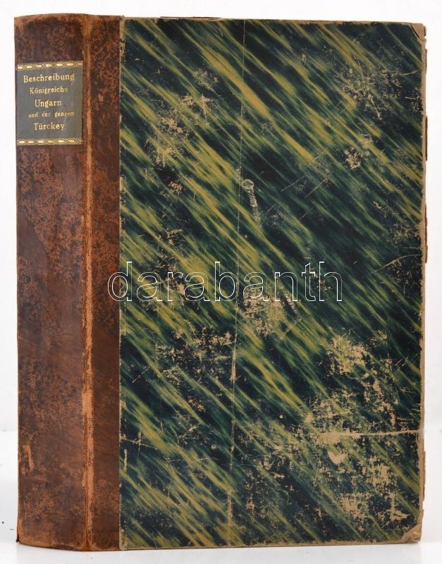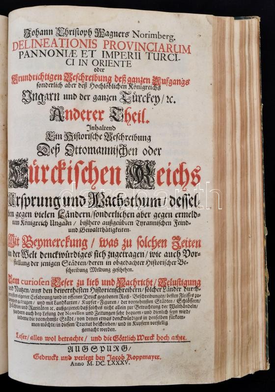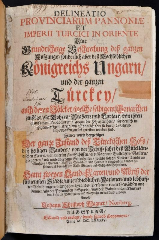 Wagner, Johann Christoph: Delineatio provinciarum Pannoniae et Imperii Turcici in Oriente. Eine Grundrichtige Beschreibung dess ganzen Aufgangs, sonderlich aber dess Hochlöblichen Königreichs Ungarn, und der ganzen Türkey...durch Johann Christoph Wagner, Noriberg. [1. kötet. Első kiadás.] Augsburg, 1684. J. Koppmayer. címképmetszet hiányzik, 4 sztl. lev. 162 p, 4 sztl. lev. (regiszter). 10 rézmetszetű tábla (43 helyett), közöttük duplaoldalasak. + hozzákötve a mű azonos című, egy évvel később kiadott második része is 9 további metszet tábla, közöttük számos magyar városképpel (mind lefényképezve). A címlap sérült, egy metszet részben pótolt, egy sérült. XIX. századi félbőr kötésben. Magyarország és a török birodalom gazdagon illusztrált leírása.
