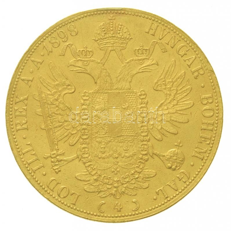 Ausztria 1898. 4D Au "Ferenc József" (13,92g/0.986) T:2,2- k... https://www.darabanth.com/en/30-Major-auction/30.1/Numismatics/Gold-coins-and-commemorative-medallions~12140/Ausztria-1898-4D-Au-Ferenc-Jozsef-13-92g0986-T2-2-kis-ph-karc-fulnyom--Austria-1898~II1853604