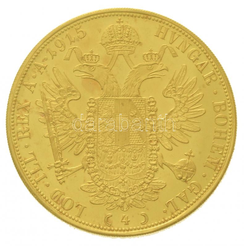 Ausztria 1915. 4D Au "Ferenc József" utánveret (13,99g/0.986... https://www.darabanth.com/en/30-Major-auction/30.1/Numismatics/Gold-coins-and-commemorative-medallions~12140/Ausztria-1915-4D-Au-Ferenc-Jozsef-utanveret-13-99g0986-T1-2-kis-ph-feluleti-karc--Au~II1853598