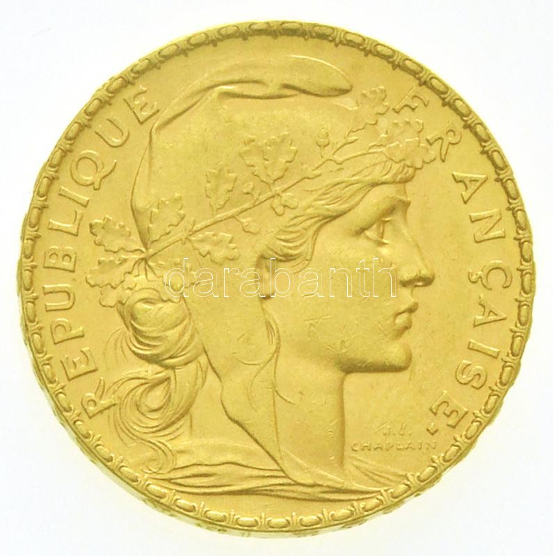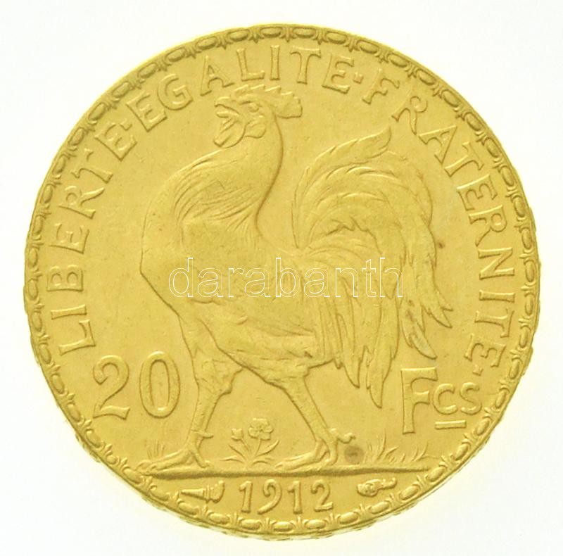Franciaország 1912. 20Fr Au "LIBERTÉ ÉGALITÉ FRATERNITÉ" utá... https://www.darabanth.com/en/30-Major-auction/30.1/Numismatics/Gold-coins-and-commemorative-medallions~12140/Franciaorszag-1912-20Fr-Au-LIBERTE-EGALITE-FRATERNITE-utanveret-6-44g0900-T2--Franc~II1852454
