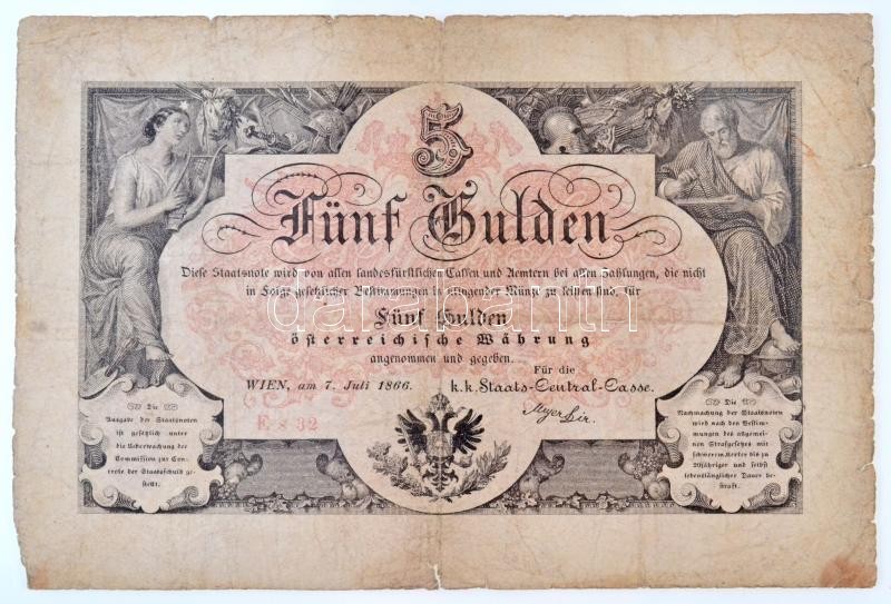https://www.darabanth.com/en/30-Major-auction/30.1/Numismatics/Hungarian-and-foreign-banknotes~12141/1866-5G-piros-szamozas-TIV-szakadasok-tuly--Austrian-Empire-1866-5-Gulden-with-red-serial~II1848105