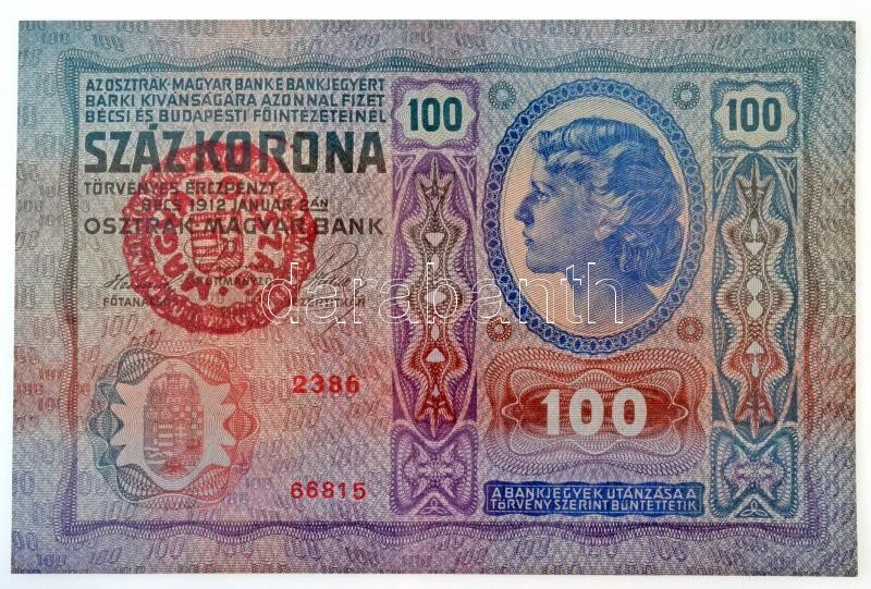 https://www.darabanth.com/en/30-Major-auction/30.1/Numismatics/Hungarian-and-foreign-banknotes~12141/1912-100K-piros-MAGYARORSZAG-felulbelyegzessel-TI-Hungary-1912-100-Korona-with-red-MAGYA~II1846168