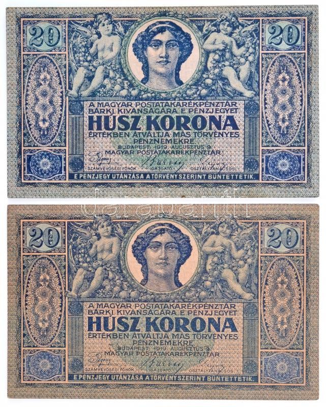 /... https://www.darabanth.com/en/30-Major-auction/30.1/Numismatics/Hungarian-and-foreign-banknotes~12141/1919-augusztus-9-20K-2x-egyik-szinhianyos-TII-III-szep-papir--Hungary-9th-August-1919-~II1857987