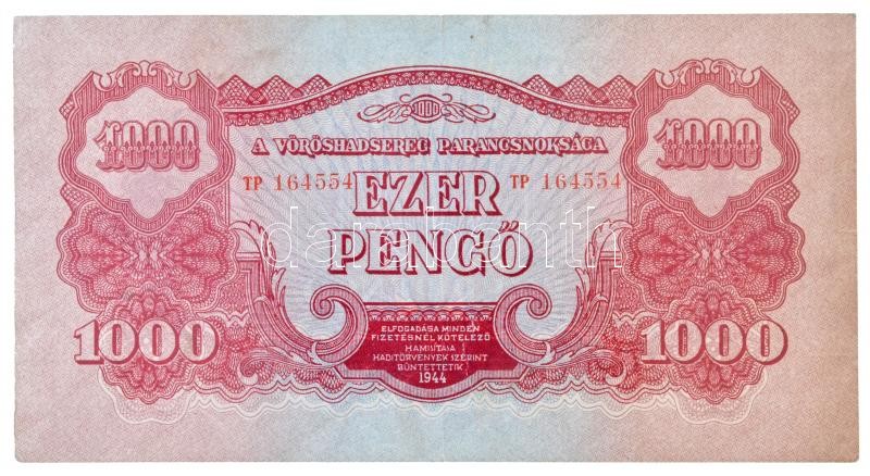 1944. 1000P "A Vöröshadsereg Parancsnoksága" T:III kis szaka... https://www.darabanth.com/en/30-Major-auction/30.1/Numismatics/Hungarian-and-foreign-banknotes~12141/1944-1000P-A-Voroshadsereg-Parancsnoksaga-TIII-kis-szakadas-fo--Hungary-1944-1000-PengC5~II1848076