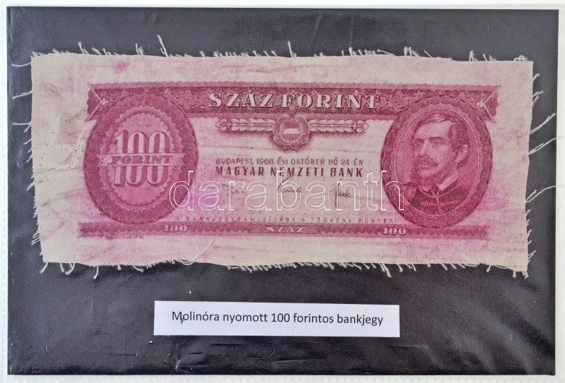 1968. 100Ft nyomógépi meghibásodás miatt textíliára nyomott előlapi ny... https://www.darabanth.com/en/30-Major-auction/30.1/Numismatics/Hungarian-and-foreign-banknotes~12141/1968-100Ft-nyomogepi-meghibasodas-miatt-textiliara-nyomott-elolapi-nyomat-a-szeleken-feket~II1850154