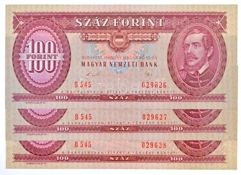 1989. 100Ft (3x) sorszámkövetők "B545 029626 - B545 029628" T:I / Hungary 1989. 100 Forint (3x) sequential serials "B545 029626 - B545 029628" C:UNC