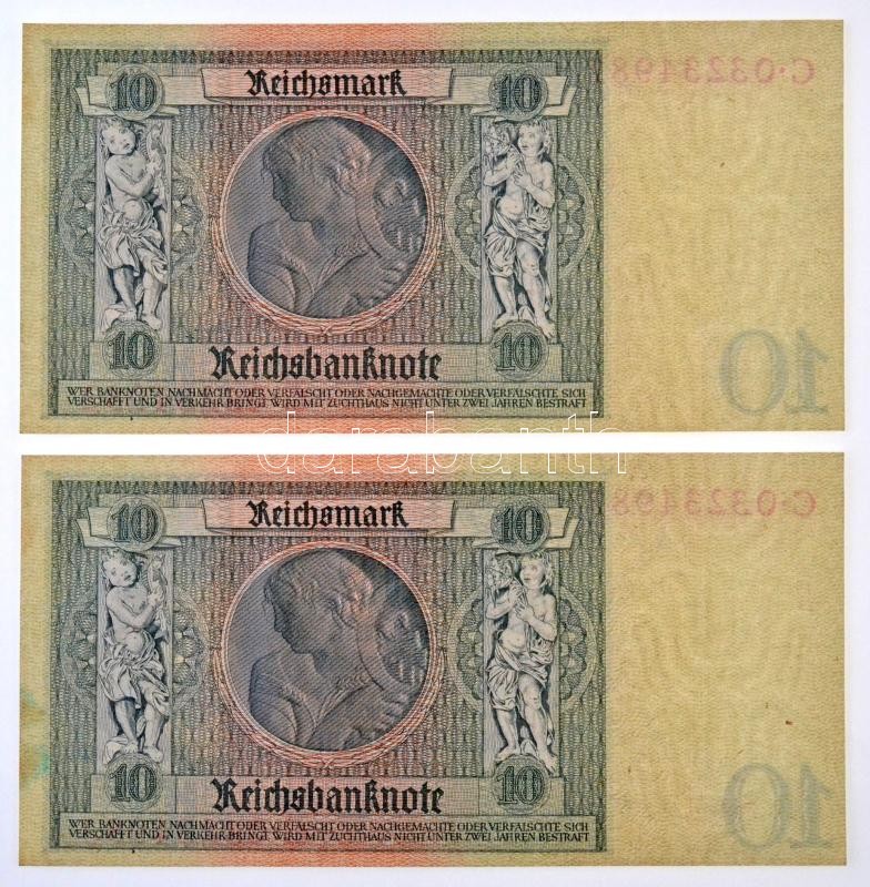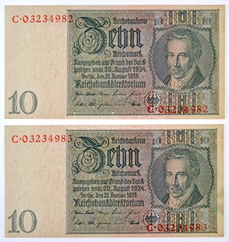 Németország / Weimari Köztársaság 1929. 10M (2x) sorszámkövetők, "C 03234982 - C 03234983" T:I / Germany / Weimar Republic 1929. 10 Mark (2x) sequential serials "C 03234982 - C 03234983" C:UNC