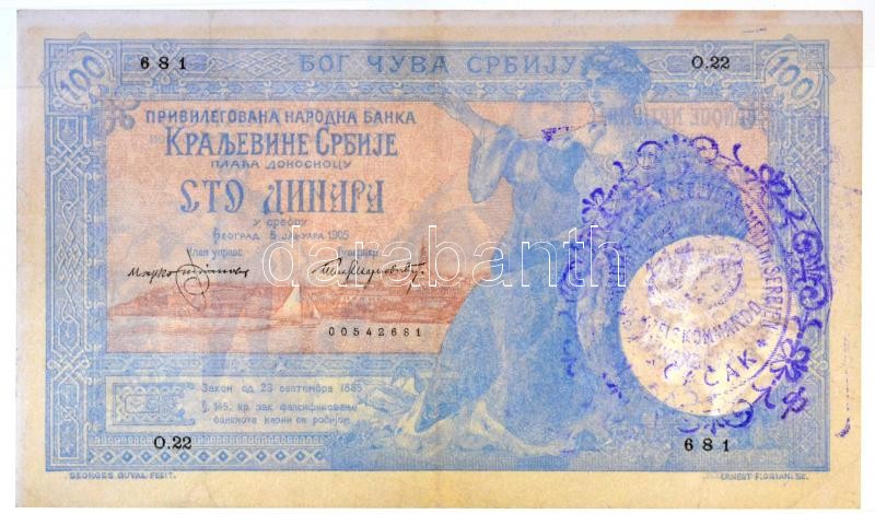 / Serbia 1905. 100 Dinara with "681 0.22" serial number, with "KuK Militär-Generalgouvernement in Serbien - Kreiskommando Cacak" cancellation on the papers watermarked part C:XF