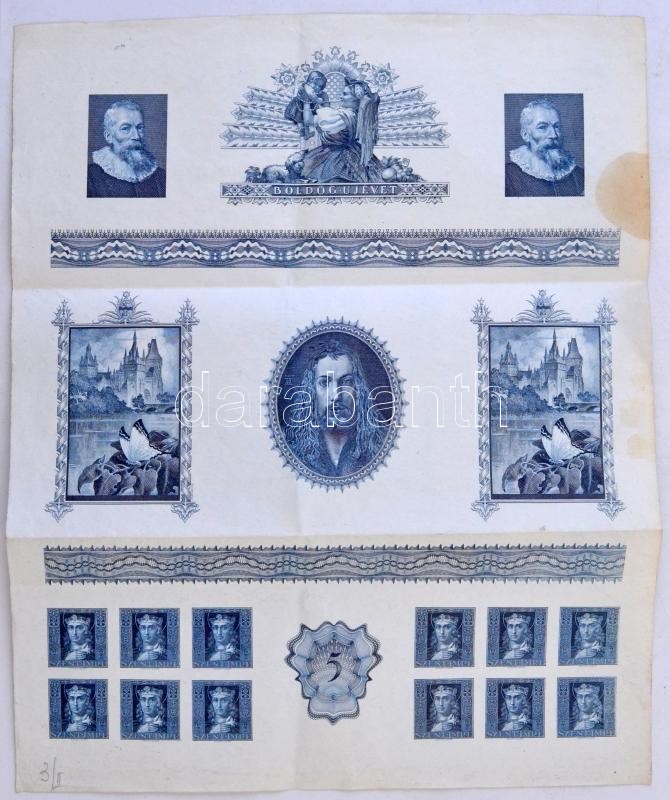 Horváth Endre (1896-1954) festőművész és grafikus különböző munkáinak tervei egy lapon, közte 1940. 2P hátlapi terv, Vajdahunyad vár, Szent Imre bélyegterv. T:III fo. / Several designs of Hungarian painter and graphic artist Endre Horváth (1896-1954), including reverse design of 1940. 2 Pengő banknote, Vajdahunyad castle nad Saint Emeric stamp design. C:F spot