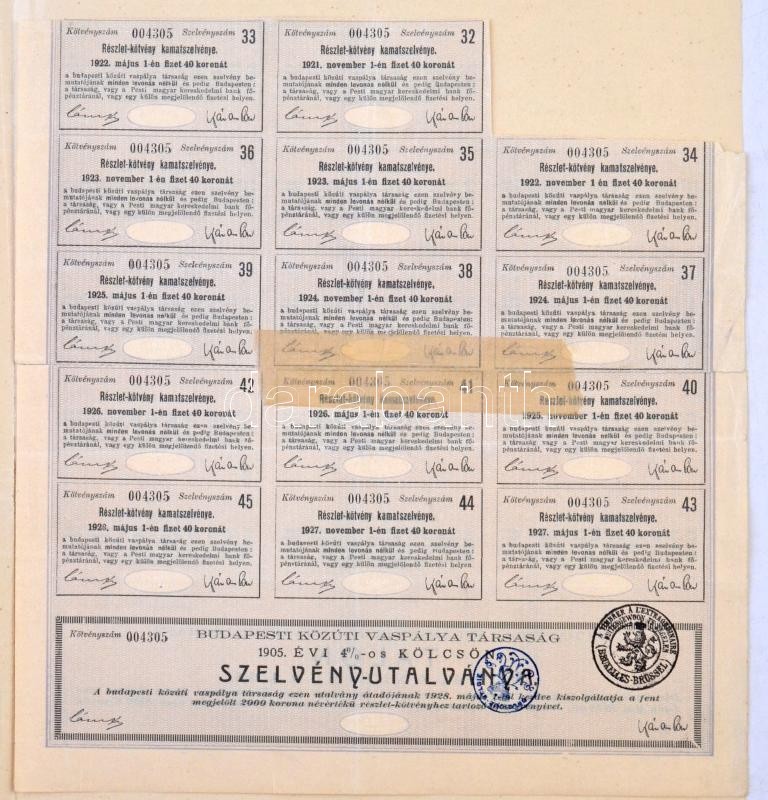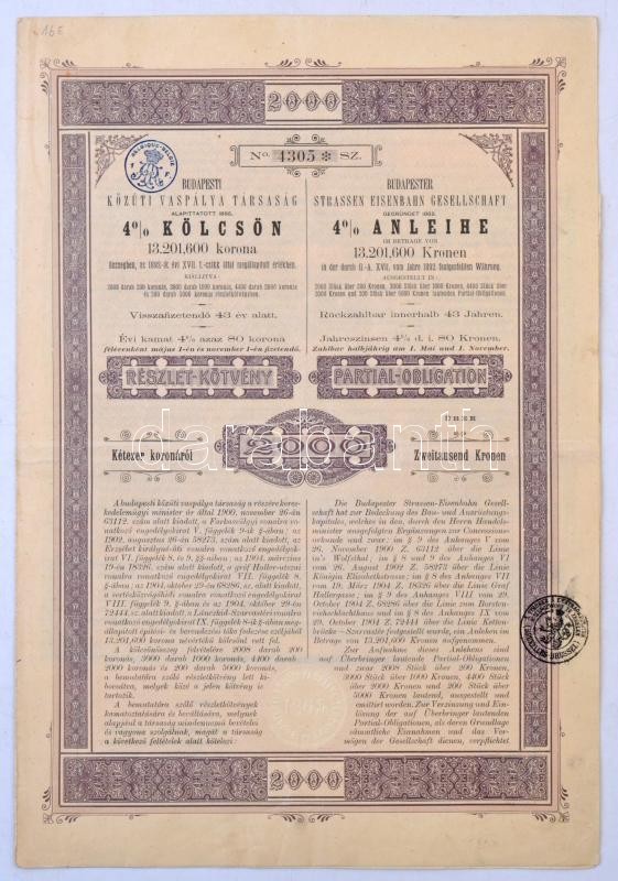 Budapest 1905. "Budapesti Közúti Vaspálya Társaság - 4% elsőbbség... https://www.darabanth.com/en/30-Major-auction/30.1/Numismatics/Shares-tickets-emergency-coins-and-notes~12150/Budapest-1905-Budapesti-Kozuti-Vaspalya-Tarsasag-4-elsobbsegi-kolcson-kotvenye-2000~II1862007