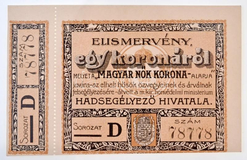 Budapest 1914-1919. "Magyar Nők Korona Alapja I." 1K "D... https://www.darabanth.com/en/30-Major-auction/30.1/Numismatics/Shares-tickets-emergency-coins-and-notes~12150/Budapest-1914-1919-Magyar-Nok-Korona-Alapja-I-1K-D-sorozat-szelvennyel-TI-Hungary-Buda~II1846075