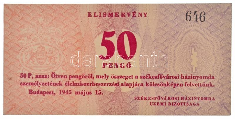 Budapest 1945. "Székesfővárosi Házinyomda" elismervény 50P-r...