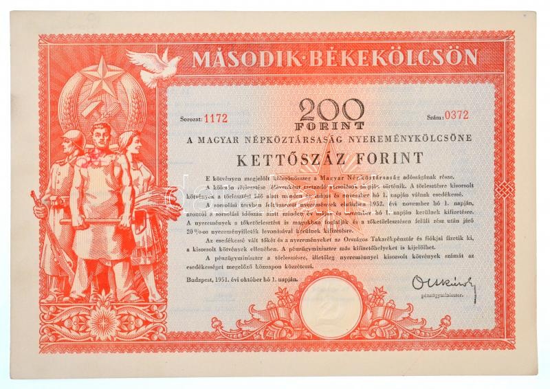 https://www.darabanth.com/en/30-Major-auction/30.1/Numismatics/Shares-tickets-emergency-coins-and-notes~12150/Budapest-1951-Masodik-Bekekolcson-nyeremenykolcson-kotvenye-200Ft-rol-TI-I-Hungary-~II1861754