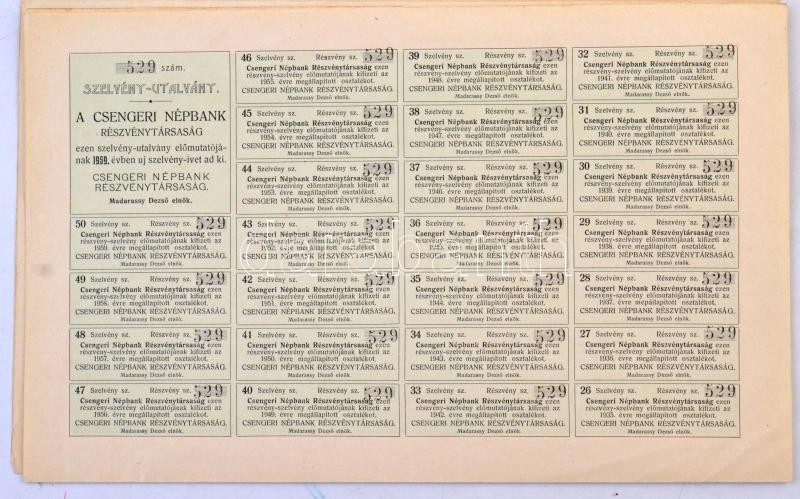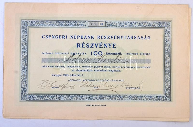 Csenger 1910. "Csengeri Népbank Részvénytársaság" névre szóló részvénye 100K-ról, szelvényekkel T:I-,II ázásnyom / Hungary / Csenger 1910. "Csengeri Népbank Részvénytársaság" share with the shareholder's name, about 100 Korona, with coupons, soaked C:AU,XF