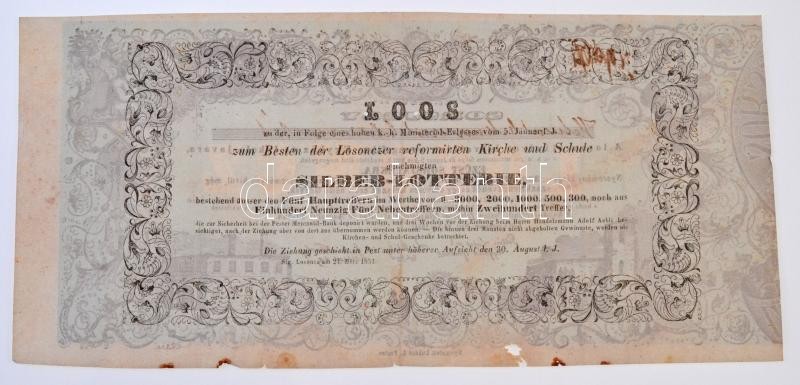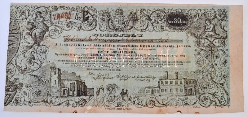 Losonc 1851. "Sorsjegy - A losonczi helvét hitvallású evangelikus Egyház és Iskola javára" 30kr értékben, kézi sorszámmal, lyukasztással érvénytelenítve T:III- szakadás, anyaghiány / Hungary / Lucenec 1851. "Lottery Ticket for the benefit of the Lucenec Helvetian Creed Church and School" in worth of 30 Kreuzer, with handwritten serial, cancelled with hole C:VG tear