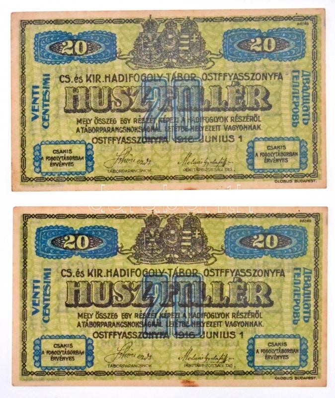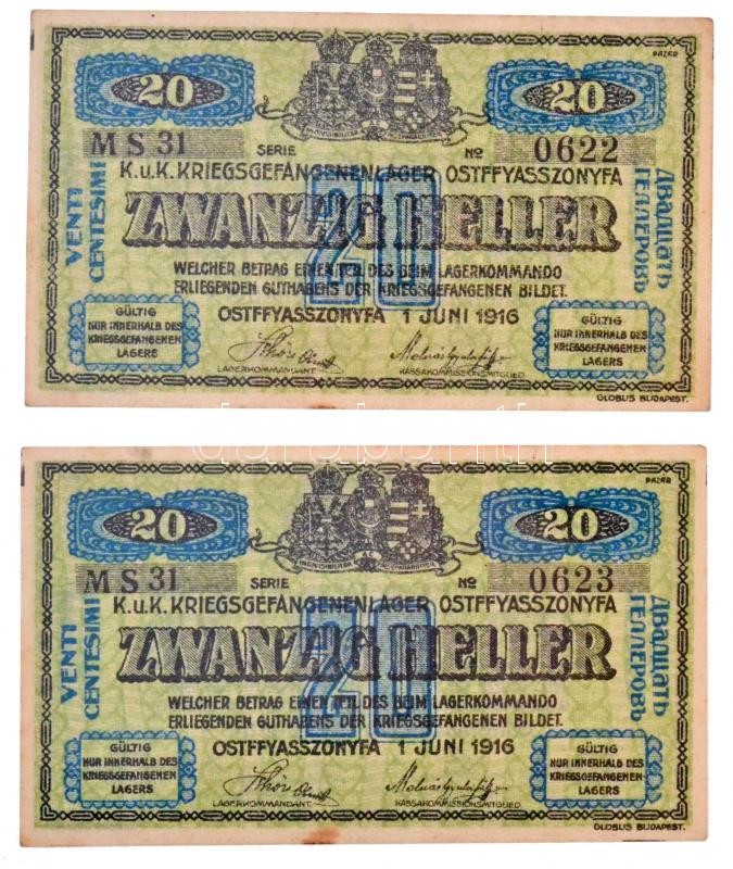 Description: Ostffyasszonyfa / hadifogolytábor 1916. június 1. 20f (2x) sorszámkövetők, arab sorozat és sorszámmal, "MS" jelzéssel T:I- / Hungary / Ostffyasszonyfa / POW Camp June 1st 1916. 20 Fillér (2x) sequential serials, arabic series and serial numerals, "MS" C:AU