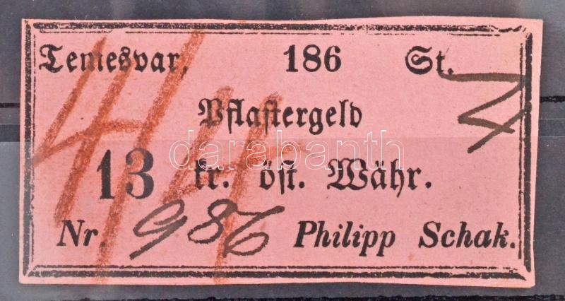 Osztrák-Magyar Monarchia / Temesvár 1860-1870. "Pflastergeld (Útadó)" 13 osztrák értékű forintról, "Philipp Schak", rózsaszín T:II / Austro-Hungarian Empire / Timisoara 1860-1870. "Pflastergeld (Pavement Tax)" about 13 Austrian value Forint, "Philipp Schak", pink C:XF