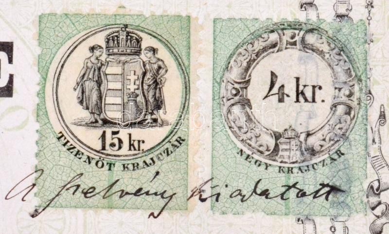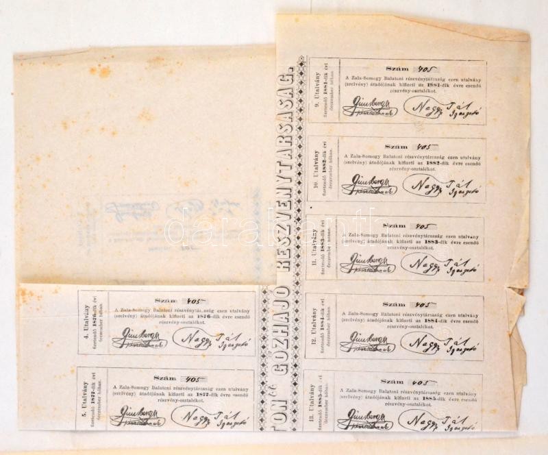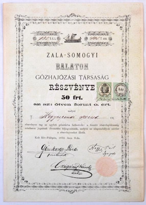 Révfülöp 1872. "Zala-Somogyi Balaton Gőzhajózási Társaság" névre szóló részvénye 50Ft-ról szelvényekkel, szárazpecséttel és bélyegekkel T:III / Hungary / Révfülöp 1872. "Zala-Somogyi Balaton Gőzhajózási Társaság (Zala-Somogy Balaton Steamship Company)" share with the shareholders name about 50 Forint with coupons, embossed stamp and stamps C:F
