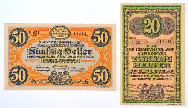 Sopronnyék / hadifogolytábor 1916. június 16. 20f arab sorozat- és sorszám + Zalaegerszeg / hadifogolytábor 1916. augusztus 15. 50f arab sorozat és sorszámmal, "MS" jelzéssel T:I / Hungary / Sopronnyék / POW Camp June 16th 1916. 20 Fillér with arabic series and serial numerals + Zalaegerszeg / POW Camp August 15th 1916. 50 Fillér with arabic series and serial numerals C:UNC