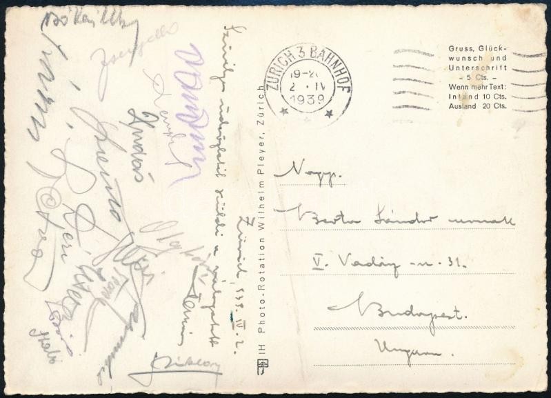 Description: 1939 Svájc-Magyarország válogatott mérkőzés magyar labdarúgó csapat által aláírt képeslap. Szabó, Olajkár, Sáros, Balogh, Zsengellér, Bíró / Hungarian football team autograph signed photo from Switzerland