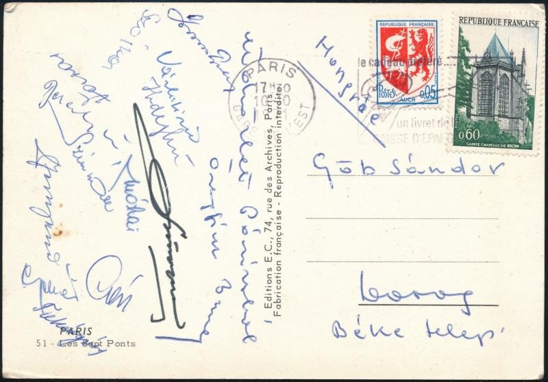 Description: 1971 Legendás magyar labdarúgókból álló öregfiúk csapat tagjainak aláírásai párizsi mérkőzésről: Grosics, Hidegkuti, Szojka, Mátrai, Zsengellér és mások / Autograph signatures of Hungarian football players from a senior match in Paris.