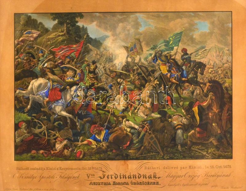 cca 1835 Jan Osolsobie (?-?) - Eduard Gurk (1801-1841): Báthorit szabadítja Kinisi a' Kenyérmezőn Oct. 13-án 1479. Ő Királyi Apostoli Felségének, V. Ferdinándnak Magyarország Királyának, Ausztria Korona Örököségnek ajánlja legmélyebb's legalázatosabb tisztelettel ajánlja Tomala Ferdinánd. Pest, Tomala Ferdinánd. Papír, színezett litográfia, üvegezett fa keretben, paszpartuban, 49x64 cm / Coloured lithography, on paper, in passe-partout, glassed wooden frame.