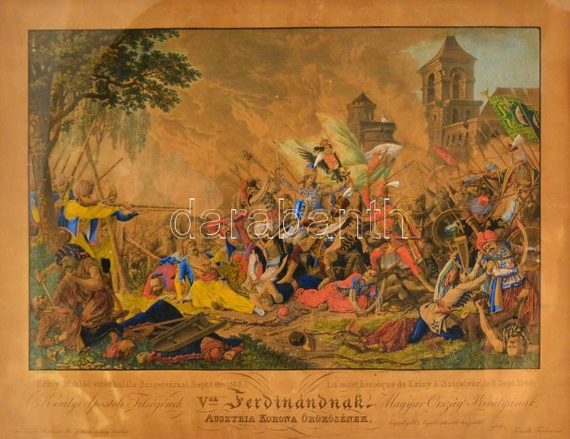 cca 1835 Jan Osolsobie (?-?) - Eduard Gurk (1801-1841): Zrínyi Miklós vitéz halála Szigetvárnál Sept. 8 dikán 1566. Ő Királyi Apostoli Felségének, V. Ferdinándnak Magyarország Királyának, Ausztria Korona Örököségnek ajánlja legmélyebb's legalázatosabb tisztelettel ajánlja Tomala Ferdinánd. Pest, Tomala Ferdinánd. Papír, színezett litográfia, üvegezett fa keretben, paszpartuban, foltos, 49x64 cm / Coloured lithography, on paper, with small stains, in passe-partout, in glassed wooden frame.