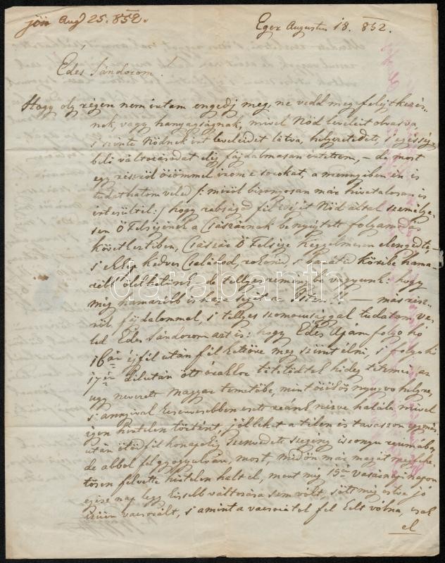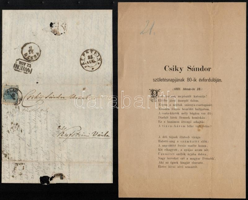 Érdekes 1848-as dokumentum: 1852 Csiky Sándor (1805-1892) nemzetőrparancsnok, politikus, egri polgármester, akit 1848-as tevékenysége miatt halálra ítéltek, majd az ítéletet várfogságra változtatták. Fogva tartása helyére Kufstein várába írott levél sógorától, melyben értesíti, hogy felesége kérelmére az uralkodó elengedi fogságának egy részét. Valamint az egri drágaságról ír. Két beírt oldal. A levél üresen hagyott részein Csiky Sándor egy évvel későbbi, saját kezű feljegyzése, mely egy meg nem nevezett hivatalosságnak írt levél és kérvény piszkozata, melyben kérelmezi, hogy mint fogoly munkát végezhessen,valamint személyes állapotáról, gondolatairól szól. Másfél beírt oldal. Hozzá: Csiky Sándor 80. születésnapjára írt köszöntő vers