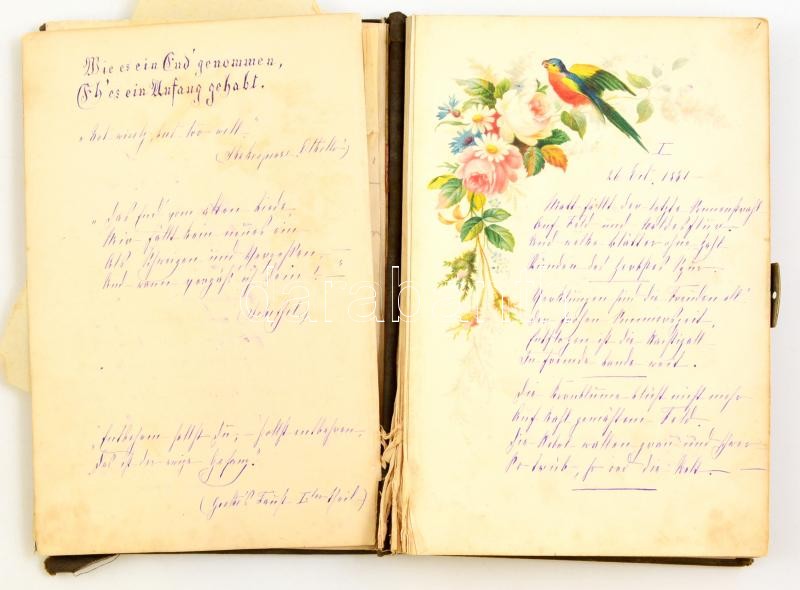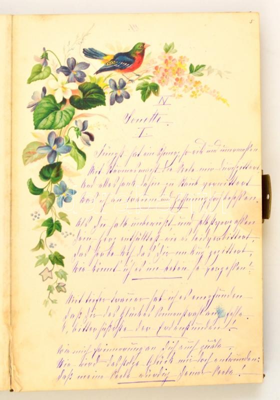 cca 1880 Czóbel Minka (1855-1947) költőnő, a szimbolizmus képviselője, a Nyugat előfutárának saját kézzel írt költeményeit tartalmazó füzet. A hosszabb és rövidebb német nyelvű versek pályájának korai szakaszából származnak. 49 beírt oldal, szétesett fűzéssel, néhány későbbi beírással is.