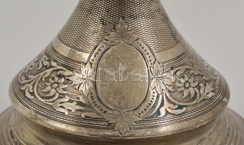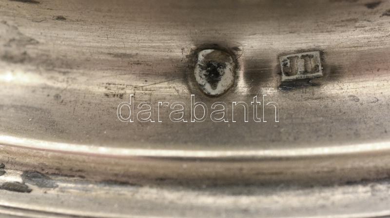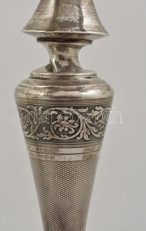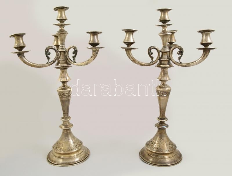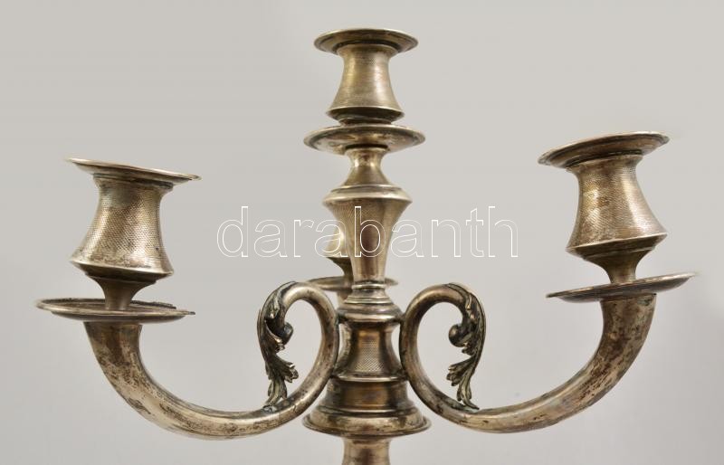 Ezüst (Ag.) historizáló karos gyertyatartópár, jelzett, mesterjeggyel (JL), levehető felső résszel, m:52 cm több helyen sérült, nettó (együtt a kettő):1630 g / Silver (Ag.) candlestick pair, hallmarked, with master mark (JL), h: 52 cm, with small damages, total net weight: 1630 g