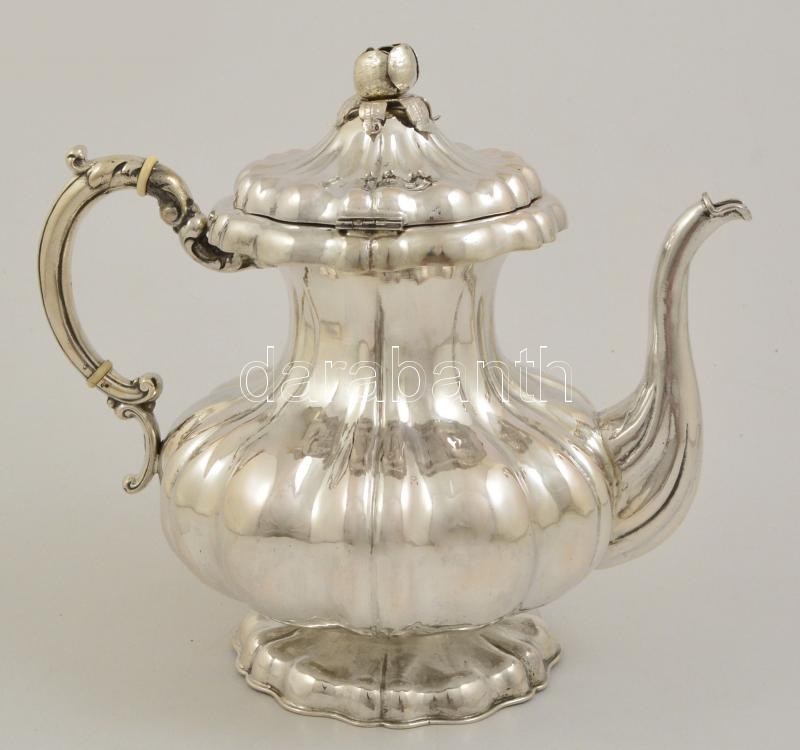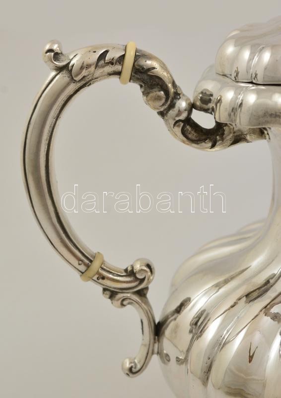 Description: Ezüst (Ag.) teakiöntő, kalapált, bordásan öblös test rózsamintás díszítéssel, elefántcsont gyűrűvel, nettó:1098 g, m:24,5 cm / Silver teapot, net.: 1098 g h: 24,5 cm