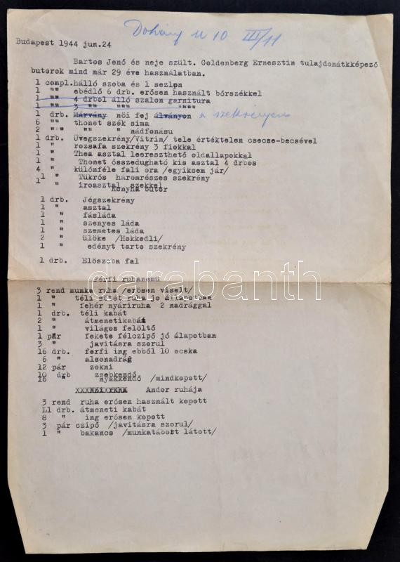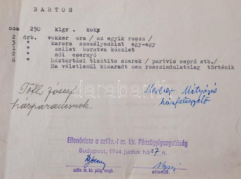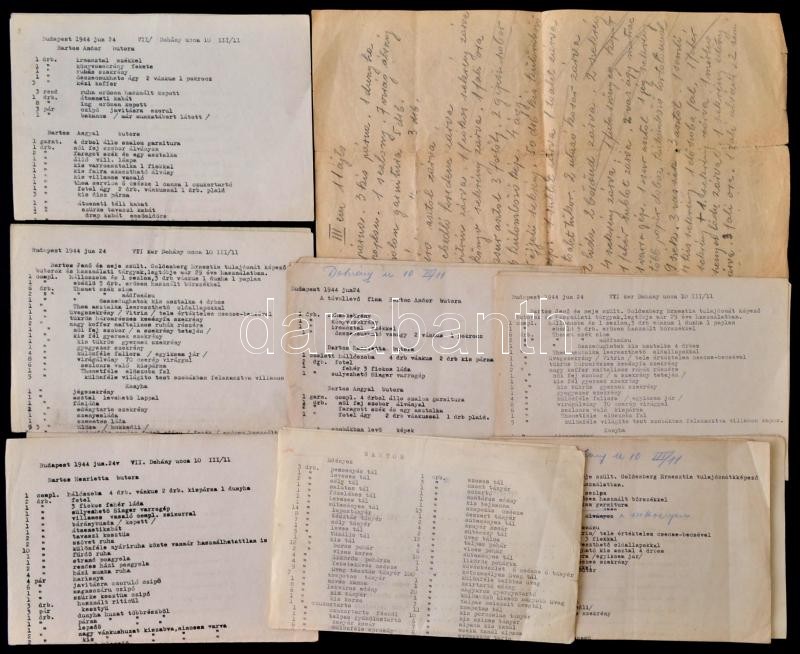 1944 VII. ker. Dohány utca 10 III/11 (Palmberger-ház) lakás ingóságainak összeírása, 1944. június. 24., a házparancsnok és a házfelügyelő aláírásaival, 8 gépelt, valamint 1 kézzel írt oldal, a kézzel írt oldalon a Nyilaskeresztes Párt bélyegzőjével. Ebbe a házba költözött be 1944. márciusában az Adolf Eichmann (1906-1962) SS Obersturmbannführer vezette politikai foglyokat begyűjtő Gestapo és Sicherheitsdienst pesti részlege, Hain Péter (1895-1946) vezette Állambiztonsági Rendészet zsidóügyekkel foglalkozó részlege, valamint itt volt irodája Ferenczy Lászlónak (1898-1946), az Eichmann mellé rendelt csendőr ezredesnek is. Az összeírás érdekessége, hogy egykori tulajdonosa, Bartos Andor (1918-1943?) 1936-ban tagja volt azoknak a diákoknak, (fiatal cserkészként,) akik Mussolini hívására Olaszországban nyaraltak. (Lásd 11970. számú tétel.)/ 1944 List of the goods of a flat in the Palmberger-house in the Dohány street (Jewish Quarter), with the signature of the house commander and janitor, 8 type-written and 1 hand-written pages, with the stamp of Arrow Cross Party, 24th Junius 1944., in Hungarian language. This house was where the Gestapo and Sicherheitsdienst by Adolf Eichmann moved in Pest, in march 1944, there was the department Jewish Affairs of State Security Office, it led by Péter Hain, and there was the office of the gendarme officier of Adolf Eichmann, colonel László Ferenczy. The owner, Andor Bartos (1918-1943) member a scout and student team were on holiday in Italy by calling of Mussolini in1936. (See the item of 11970.)