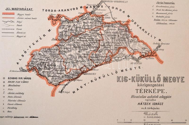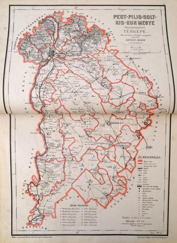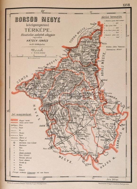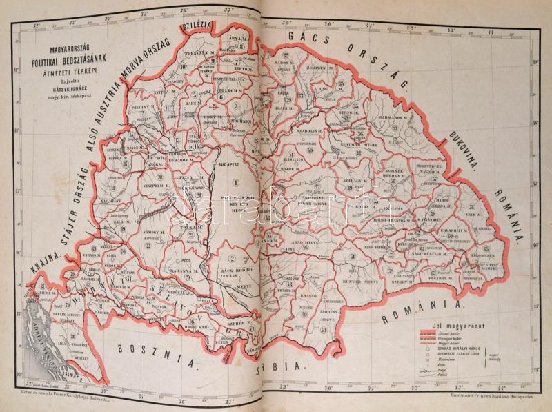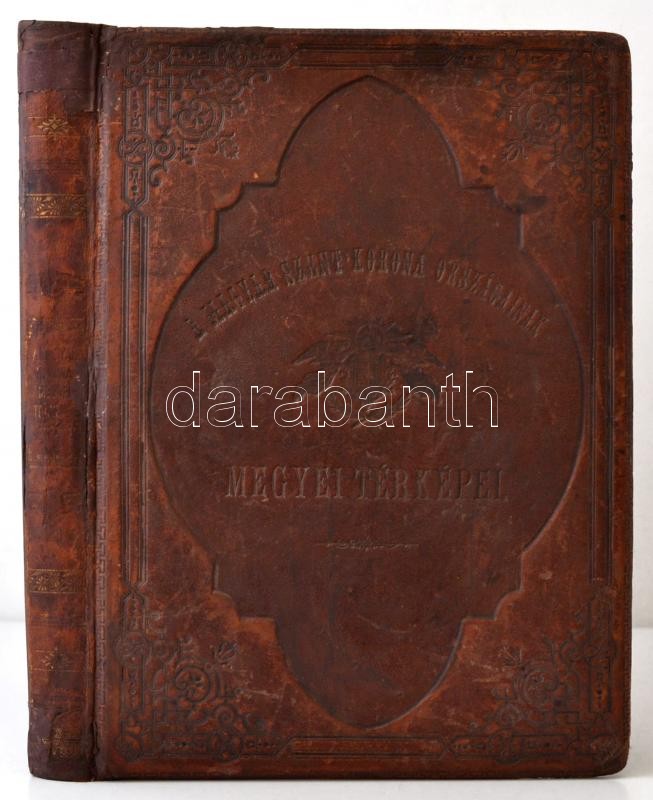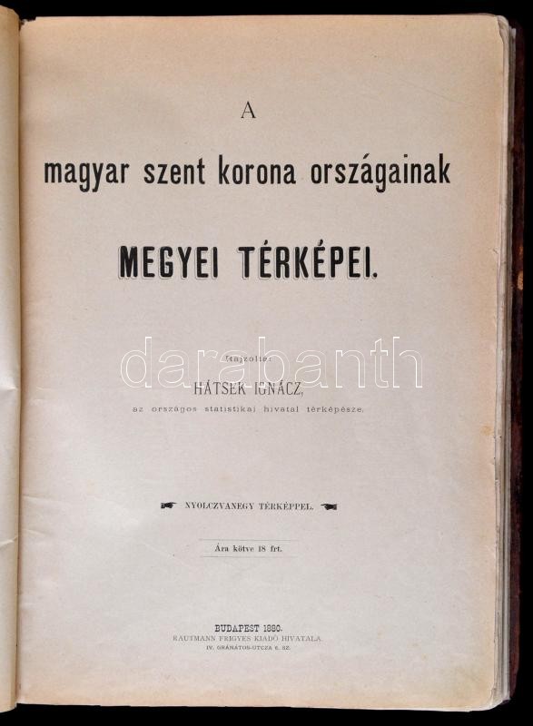 1880 Hátsek Ignác: A magyar szent korona országainak megyei térképei. Rajzolta: - -. Bp.,1880, Rautmann Frigyes, (Bp. Metszette és nyomta Posner Károly Lajos-ny.), , 4 p. + 1 (átnézeti térkép)+80 t. (térképek.) Nyolcvanegy kétszÃnű litografált térkép tábla, 1: 500.000. Kiadói egészbÅ‘r-kötés, javÃtott borÃtóval-gerinccel, megerÅ‘sÃtett kötéssel, kopottas borÃtóval, hiányzó szennylapokkal, a cÃmlap és az összesÃtÅ‘ térkép szélein kis szakadásokkal, a XLV. Csongrád térképet a XIV-XV. térkép közé kötötték be. Hiánytalan.