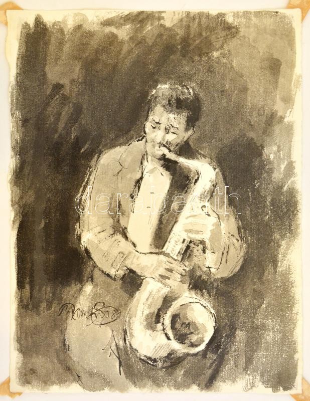 Gyémánt László (1935-): Jazz szaxofonos. Lavírozott tus, papír, jelzet...