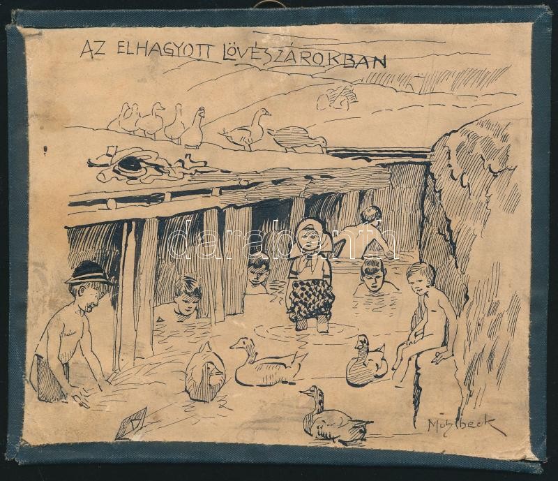 Mühlbeck Károly (1869-1943): Az elhagyott lövészárokban, karikatúra, tus, papír, jelzett, foltos, 12,5×14,5 cm
