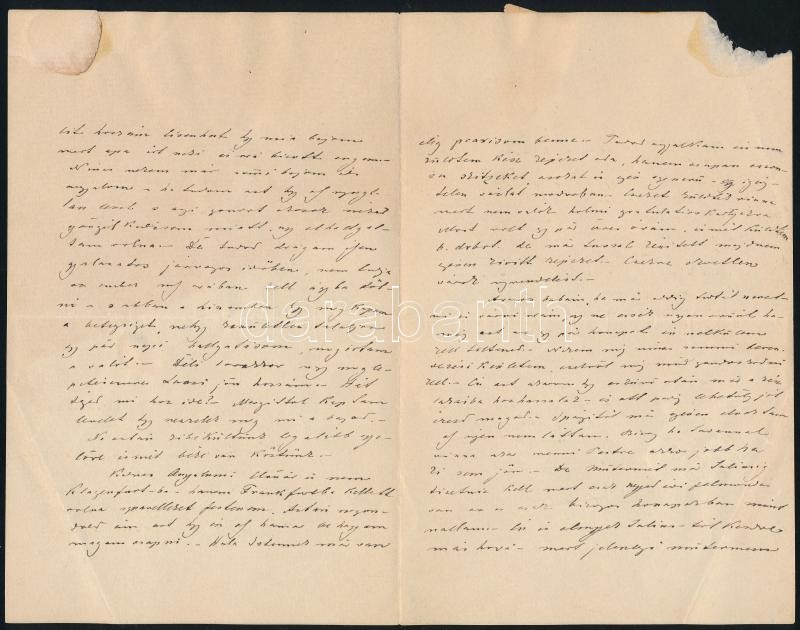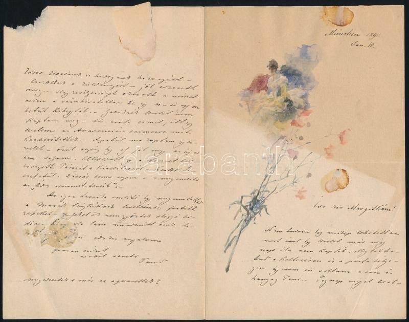 Description: Neogrády Antal (1861-1942): Édes kis Margitkám München 1890. Akvarell, papír, foltos, jelzett (Tonid), 15×8 cm. Az akvarell egy Neogrády Antal által írt hosszú levél (négy oldalas) első oldalán szerepel. A címzett felesége Telepy Margit (Telepy Károly festő lánya). Kis szakadással és folttal. 18×13 cm