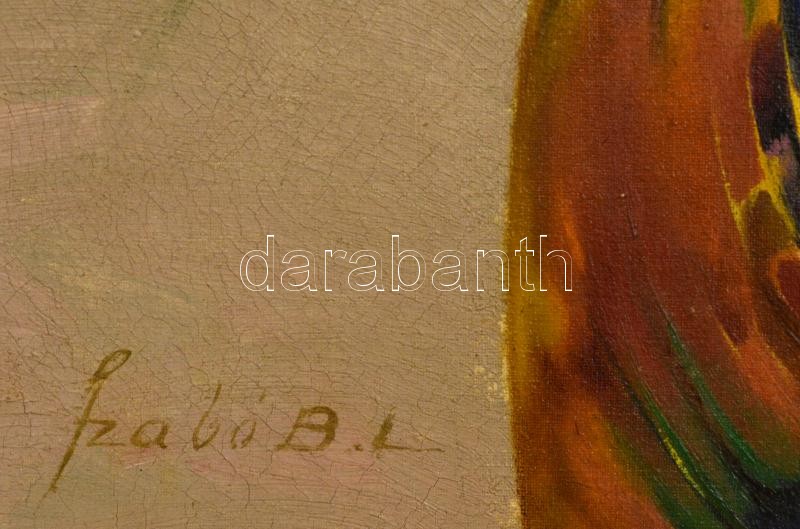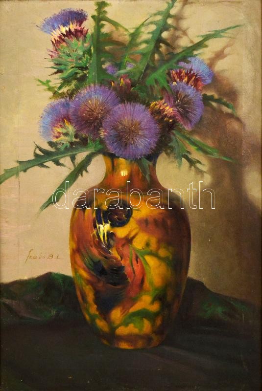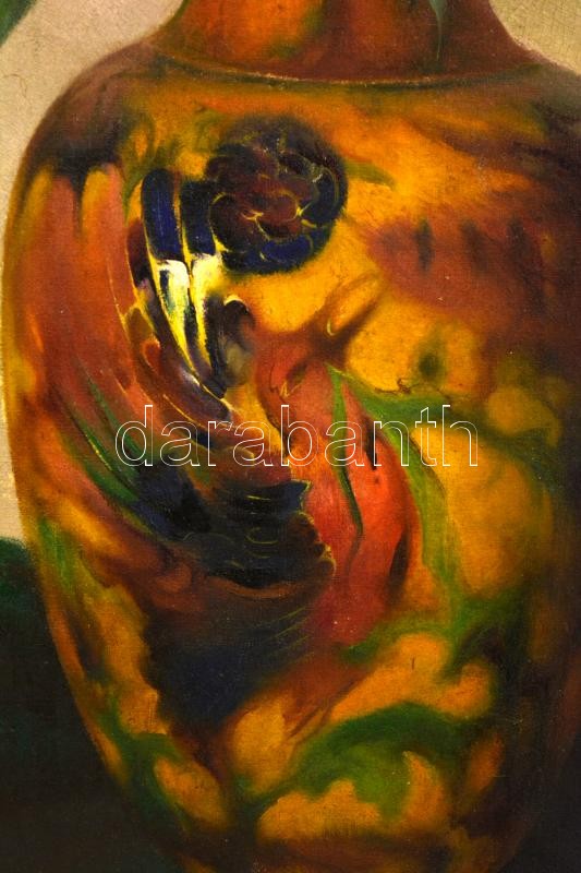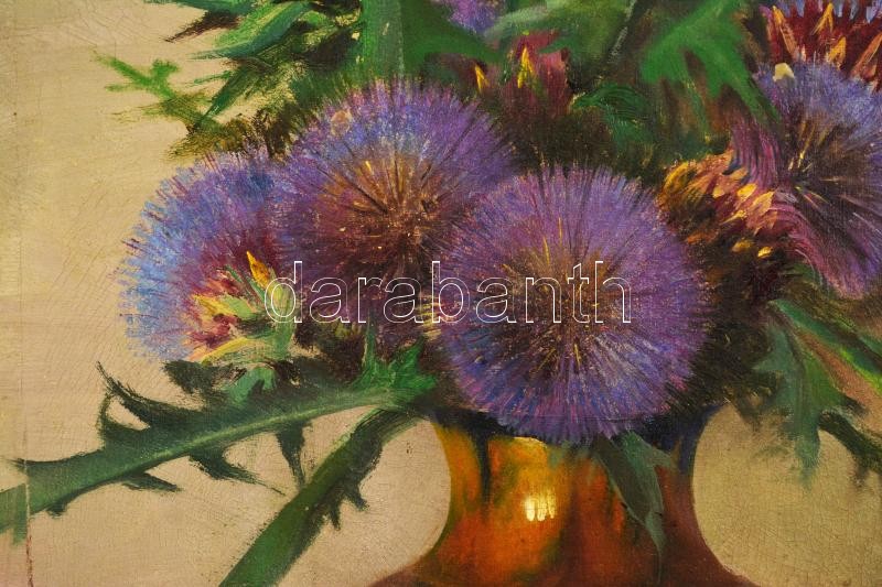 Szabó Béla Leo (1887-?): Bogáncsok Zsolnay vázában. Olaj, vászon hibával, fa keretben, 64×44 cm