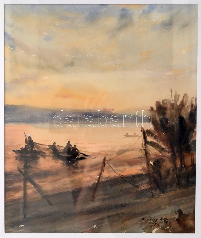 Szöllősy H. Eta (1920-): Halászok. Akvarell, papír, jelzett, üvegezett...