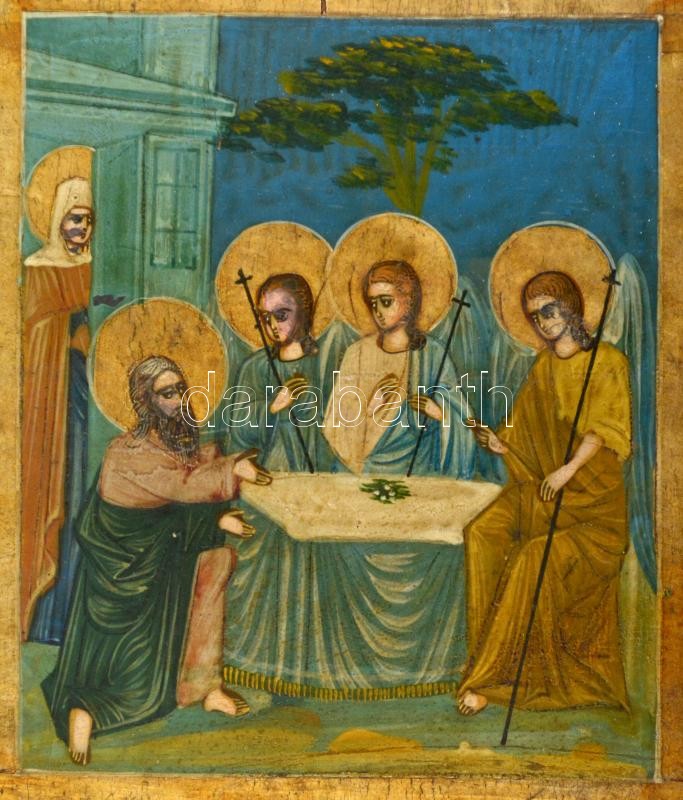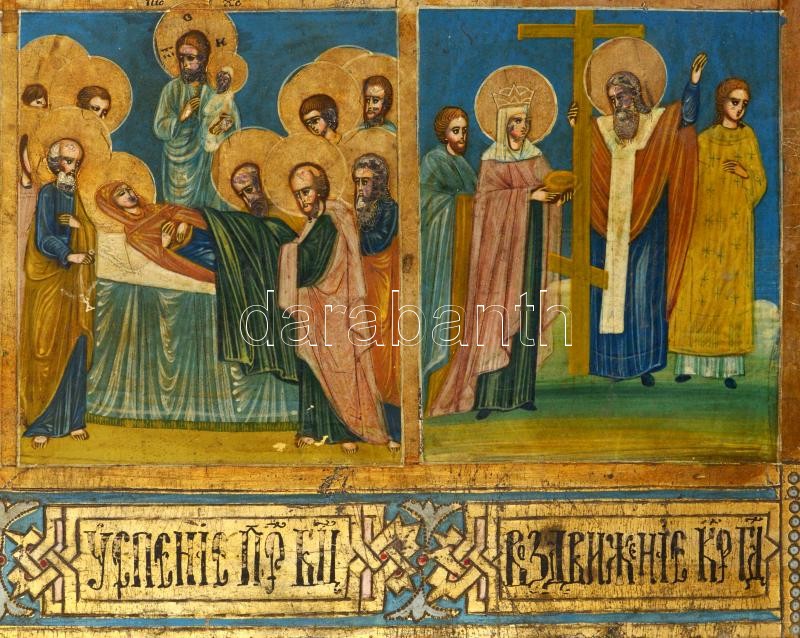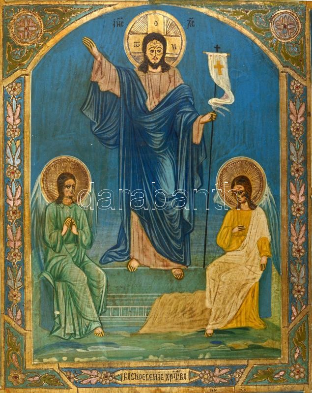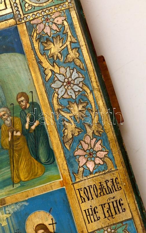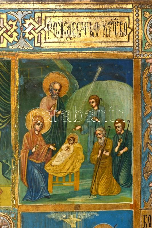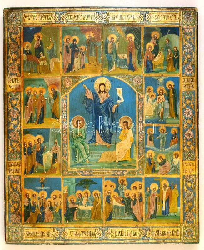 cca 1880 Krisztus feltámadása és a tizenkét nagy ünnep, orosz ikon, tojástempera, fa, sérüléssel, apró lepattanásokkal, 53,5×44,5 cm / cca 1880 The Resurrection of Christ and the Twelve Great Feasts, Russian icon, egg tempera, on wood, slightly damaged, with minor faults , 53,5×44,5 cm