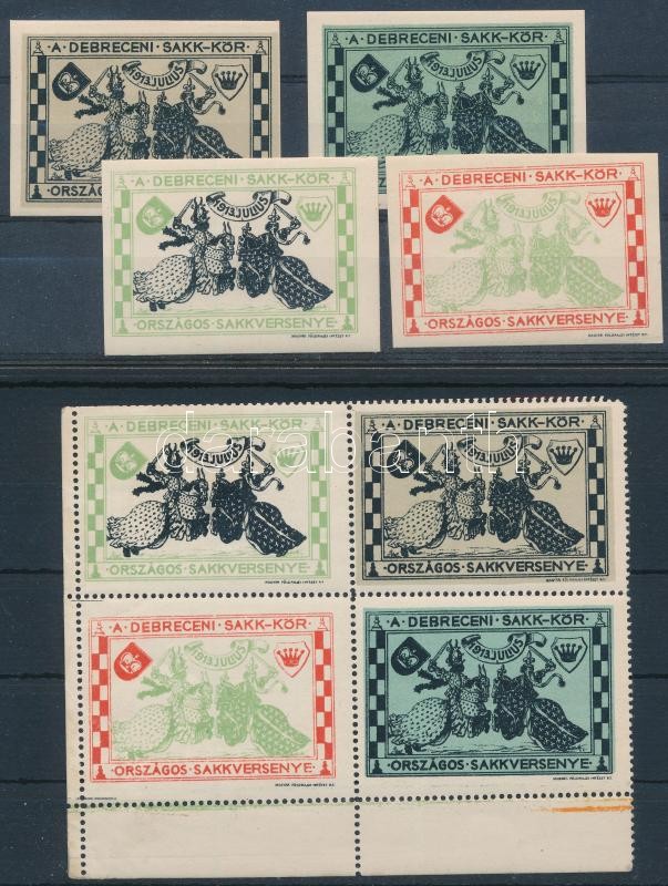 1913 Debreceni sakkverseny levélzárói: fogazott négyestömb + 4 klf vágott érték / Debrecen chess championship 4 perforated + 4 imperforate labels