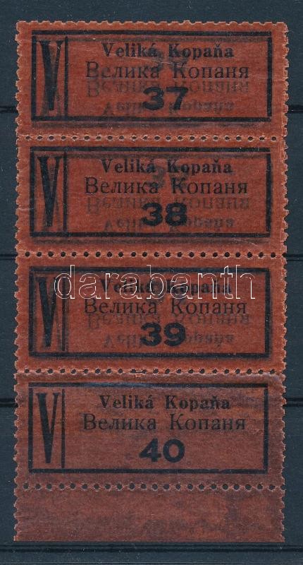 Veliká Kopana Felsőveresmart kétnyelvű ragjegy 4-es csíkban az 1930-as évekből, duplán nyomva / Bilingual label with double print, stripe of 4