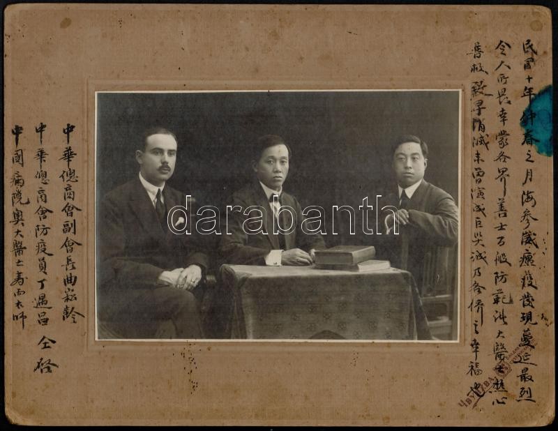 Description: 1921 Vlagyivosztok, A kínai kereskedelmi kamara elnökéről készült fotó, Schulteisz László vlagyivosztoki működése emlékére, sok kínai írásjellel, kartonra kasírozott fotó, 14×20 cm