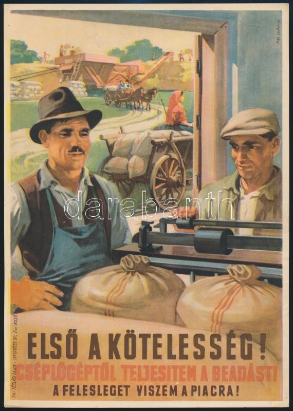 cca 1950 Pál György: Első a kötelesség Cséplőgépről teljesítem a beszo... https://www.darabanth.com/en/30-Major-auction/30.1/Other-collectibles/Poster~12198/cca-1950-Pal-Gyorgy-Elso-a-kotelesseg-Cseplogeprol-teljesitem-a-beszolgaltatast-a-fele~II1861806