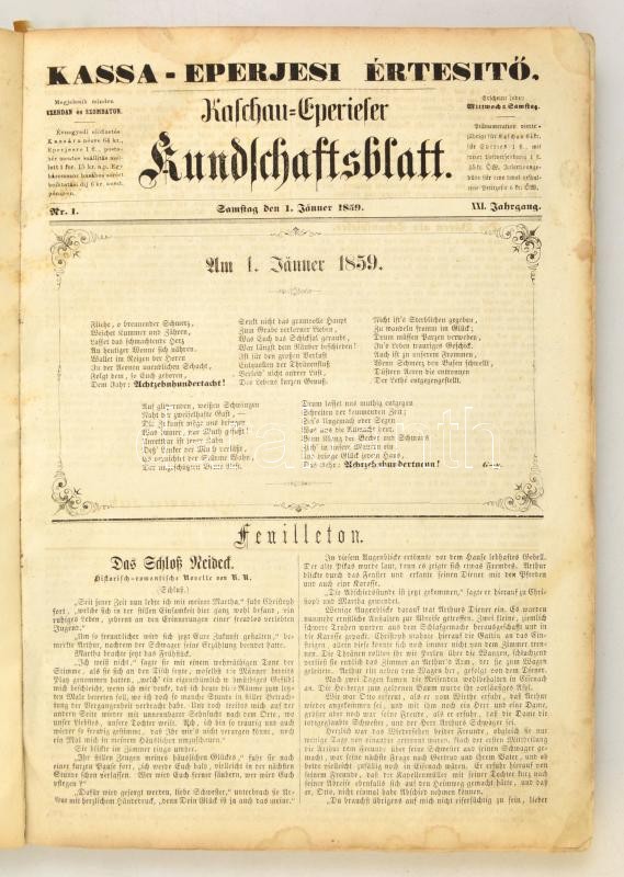 1859 Kasa-Eperjesi ÉrtesÃtÅ‘ (Kaschau-Eperieser Rundschaftsblatt) teljes évfolyama könyvbe kötve, döntÅ‘en német nyelvű hÃrekkel, értesÃtésekkel, hirdetésekkel, kisebb foltokkal, egyébként jó állapotban
