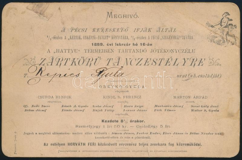 1889 Meghívó a pécsi kereskedő ifjak által szervezett táncestélyre 18x...
