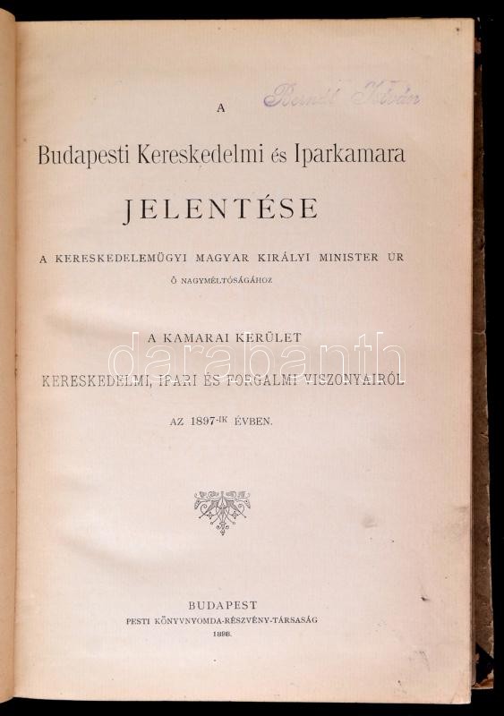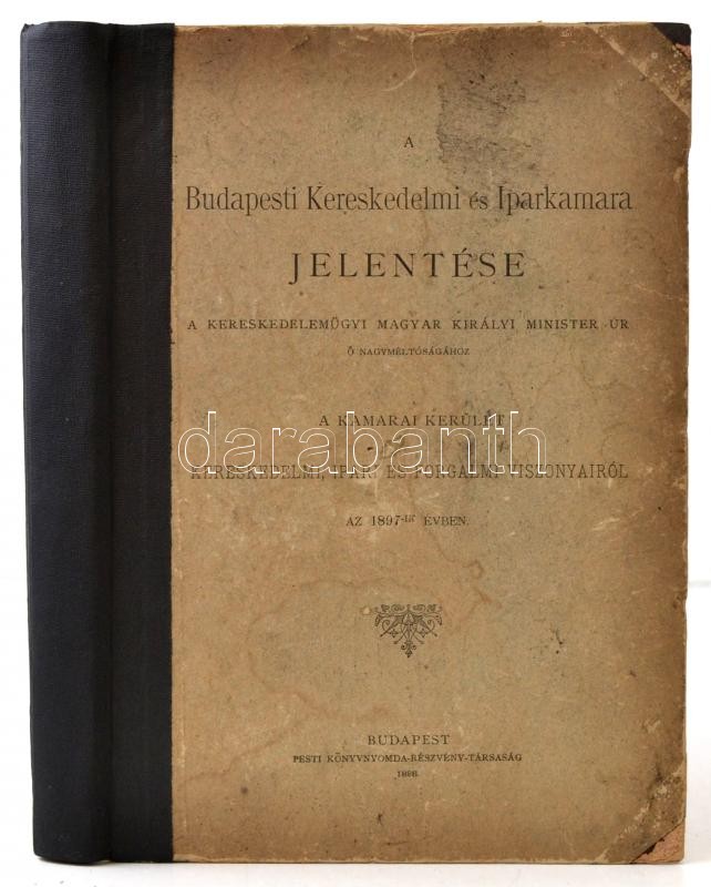 1898 A Budapesti Kereskedelmi és Iparkamara jelentése a kereskedelemügyi magyar királyi minister úr ő nagyméltóságához a kereskedelmi, ipari és forgalmi viszonyairól az 1897-ik évben. Bp., 1898, Pesti Könyvnyomda Rt., V+424 p. Átkötött félvászon-kötés, javított gerinccel, kissé foltos borítóval, márványozott lapélekkel, de belül jó állapotban.