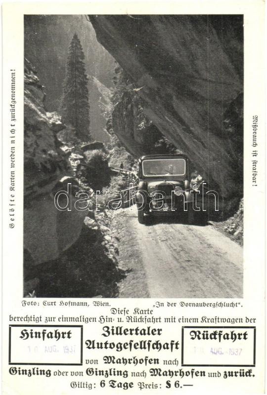 Description: 1937 Dornauberg-Schlucht, diese Karte berechtigt zur einmaligen Hin- und Rückfahrt mit einem Kraftwagen der Zillertaler Autogesellschaft / Austrian automobile shop's advertisement card (EK)