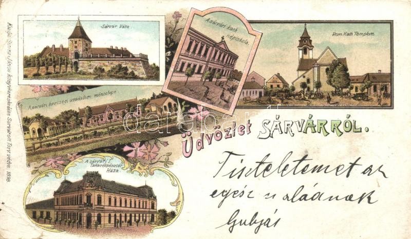 Description: 1899 Sárvár, vár, katolikus népiskola, római katolikus templom, takarékpénztár háza, hercegi uradalmi méntelep. Stranz János kiadása. Art Nouveau, floral, litho (EB)