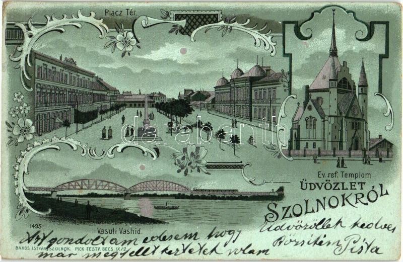 1903 Szolnok, Piac tér, Református templom, Vasúti Vashíd. Bakos István kiadása. Ezüstözött Art Nouveau, floral, litho (EK)